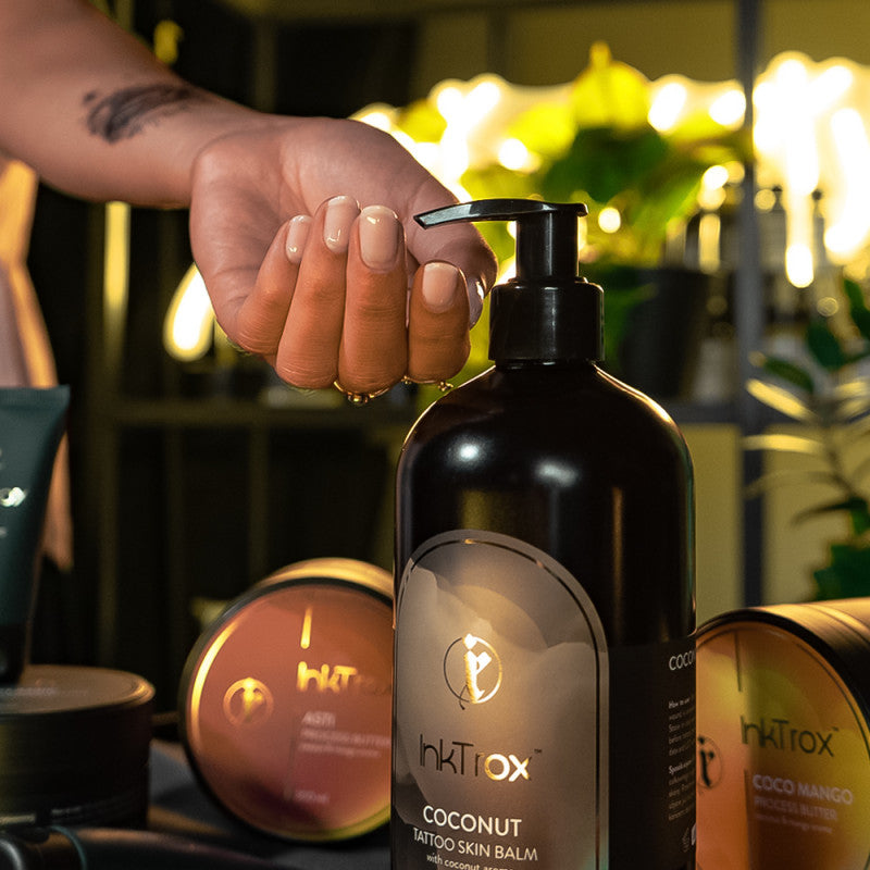 Unlike heavy balms, InkTrox Coconut offers a luxurious sensory experience with the scent of fresh coconut, turning daily skincare into a soothing ritual. It not only protects and nourishes but also helps keep tattoos vibrant and defined for years to come.