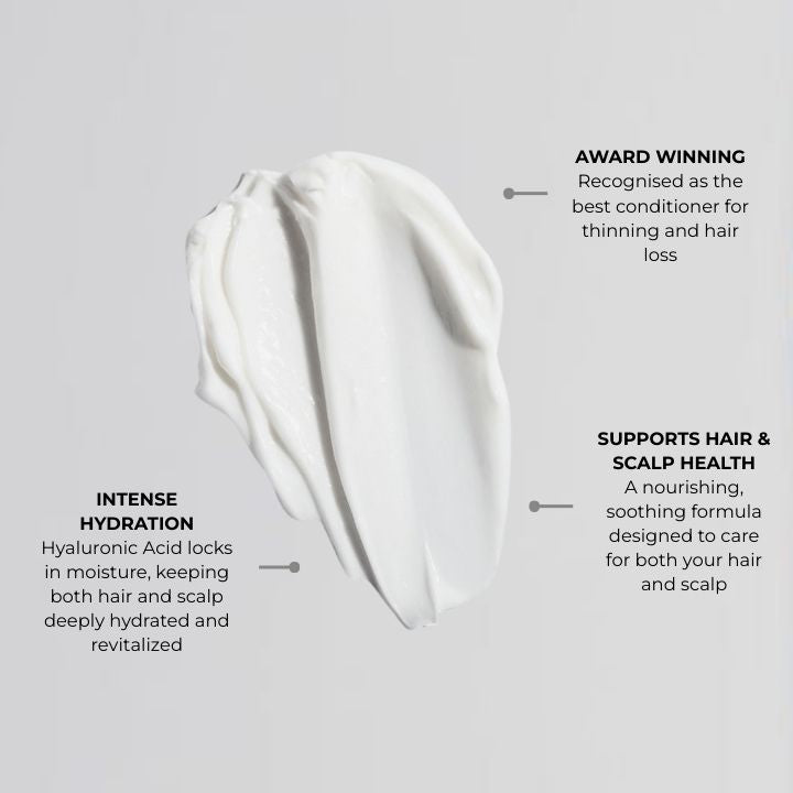 This lightweight, nourishing conditioner is scientifically formulated for fine and thinning hair. Enriched with hyaluronic acid for deep hydration, it soothes the scalp while strengthening hair fibers without weighing them down.