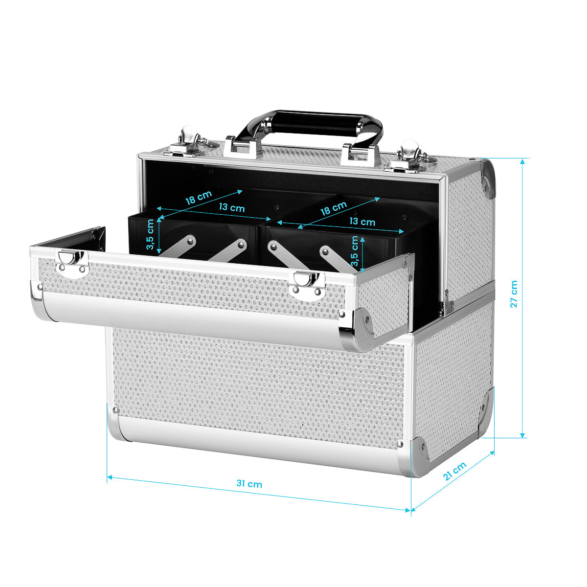 The modern design in shades of silver with glitter accents adds elegant touch. The handle makes it easy to transport, which is especially important for mobile stylists. Made of durable, damage-resistant materials, it ensures comfort of everyday use. A sturdy clasp closure with a key ensures the contents are protected and the lightweight, durable construction makes the case easy to carry.