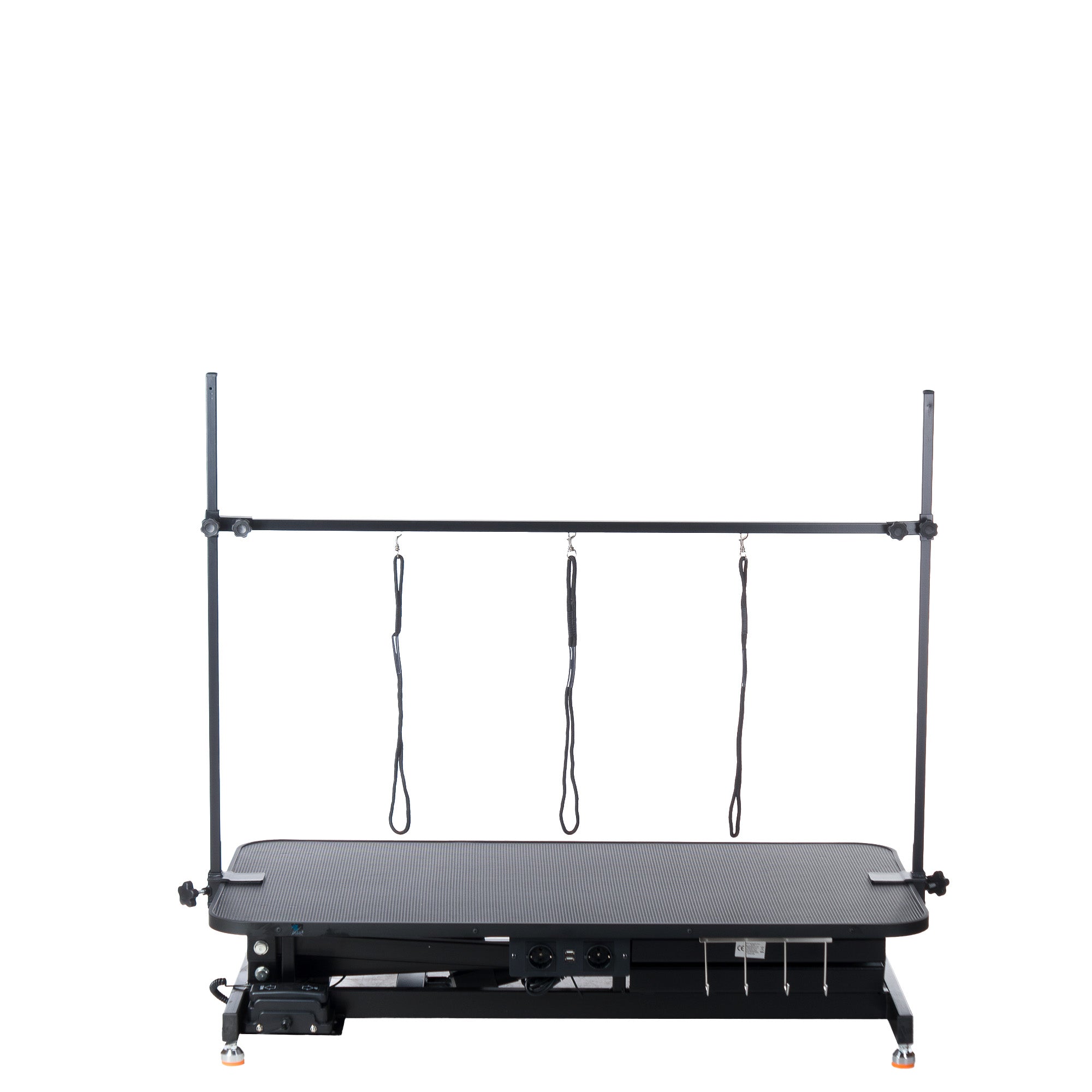 Grooming table for pet care in XL size. Extremely stable \ntable top covered with anti-slip matte in black. Steel frame in black, powder-coated. Electric height adjustment of the table top, thanks to which we can perfectly adapt to our needs and the size of the pet. In the set, height-adjustable crossbar with three leashes. <\/P>\n