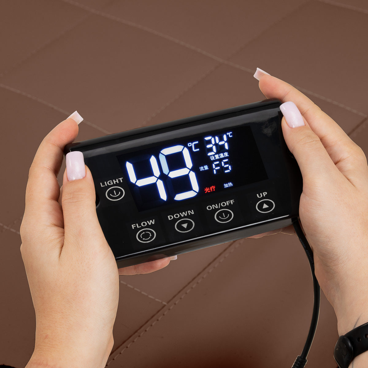 The intuitive touch panel allows for full control over treatment parameters and ease of use. It allows you to adjust the operating time and water temperature, as well as monitor their current values on a clear, easy-to-read display. Additionally, the panel allows you to activate the light therapy function, which illuminates the bowl, creating an atmosphere of relaxation and luxury. The set also includes a remote control, which allows you to conveniently control the steam therapy device from a distance.