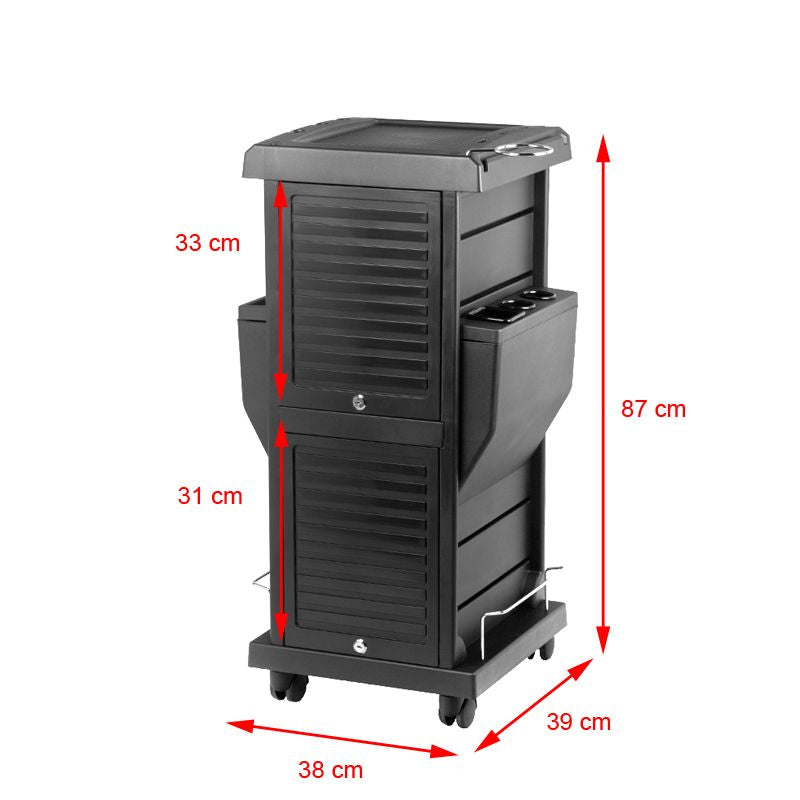 black hairdressing assistant with 2 lockable key shutters, 4 litter boxes and 15 compartments for hairdressing assortment. stable construction will ensure long-term use. table mounted on wheels, thanks to which the tools will always be at hand.