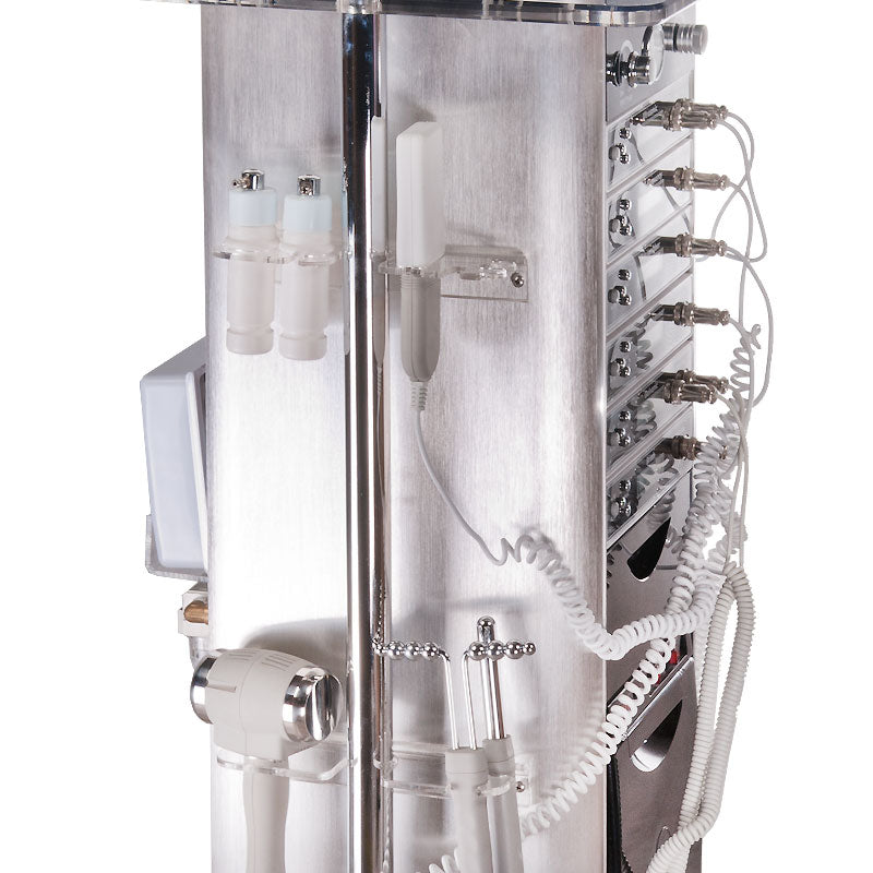 6. D'arsonval / High-Frequency / electrotherapy - enables electrotherapy using the so-called D'Arsonval currents. When the glass electrode touches the skin, the spark has a stimulating effect on the skin and underlying tissues, mainly and indirectly on the internal organs. Oxygen produced during the procedure has a antibacterial effect. Electrical charges cause dilation of blood vessels, accelerate metabolism, increase absorption of nutrients and medicinal substances contained in cosmetic preparations.