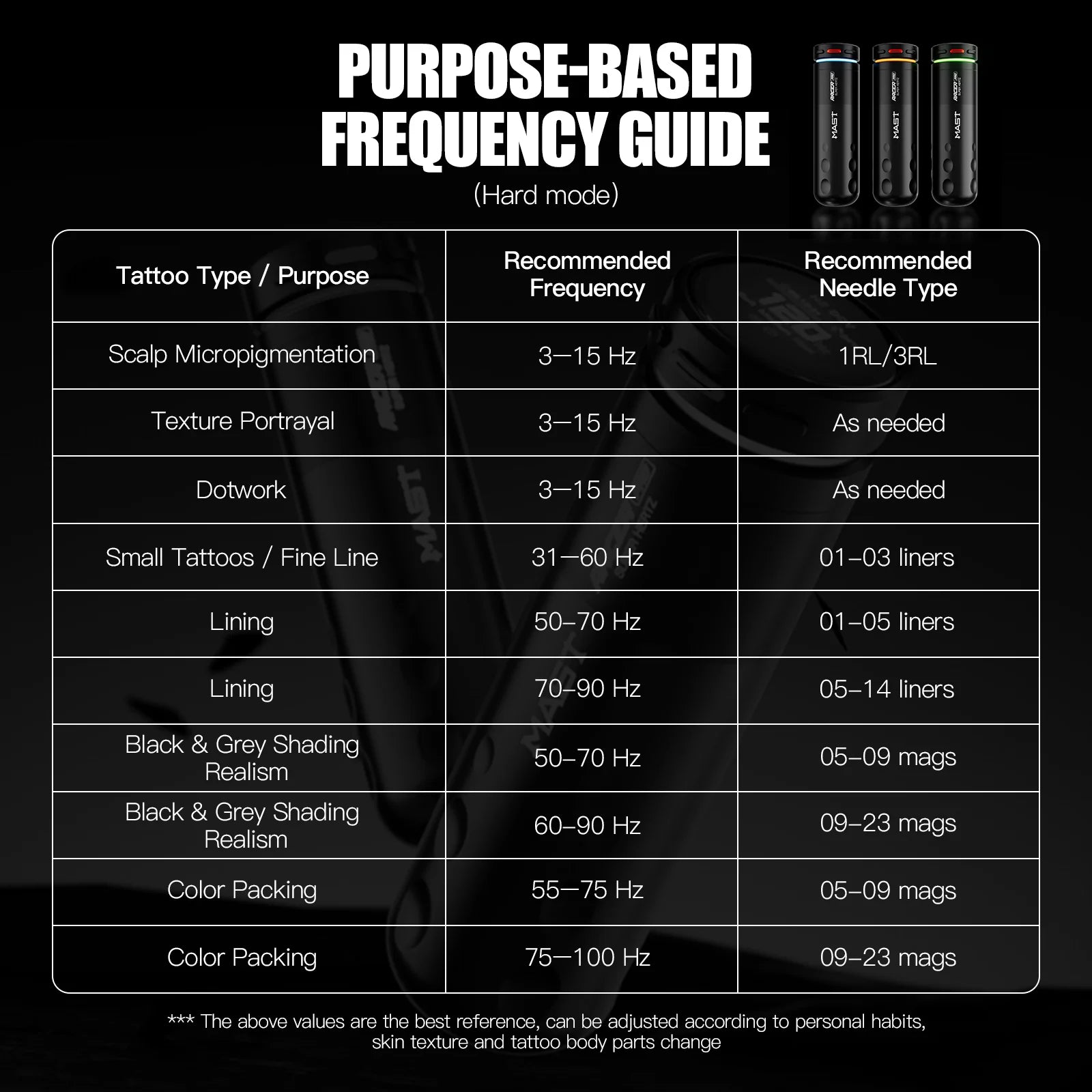 Hz Mode (3–140Hz) syncs needle movement with hand motion for responsive, steady control - with soft, medium, hard, and dot settings for tailored performance.