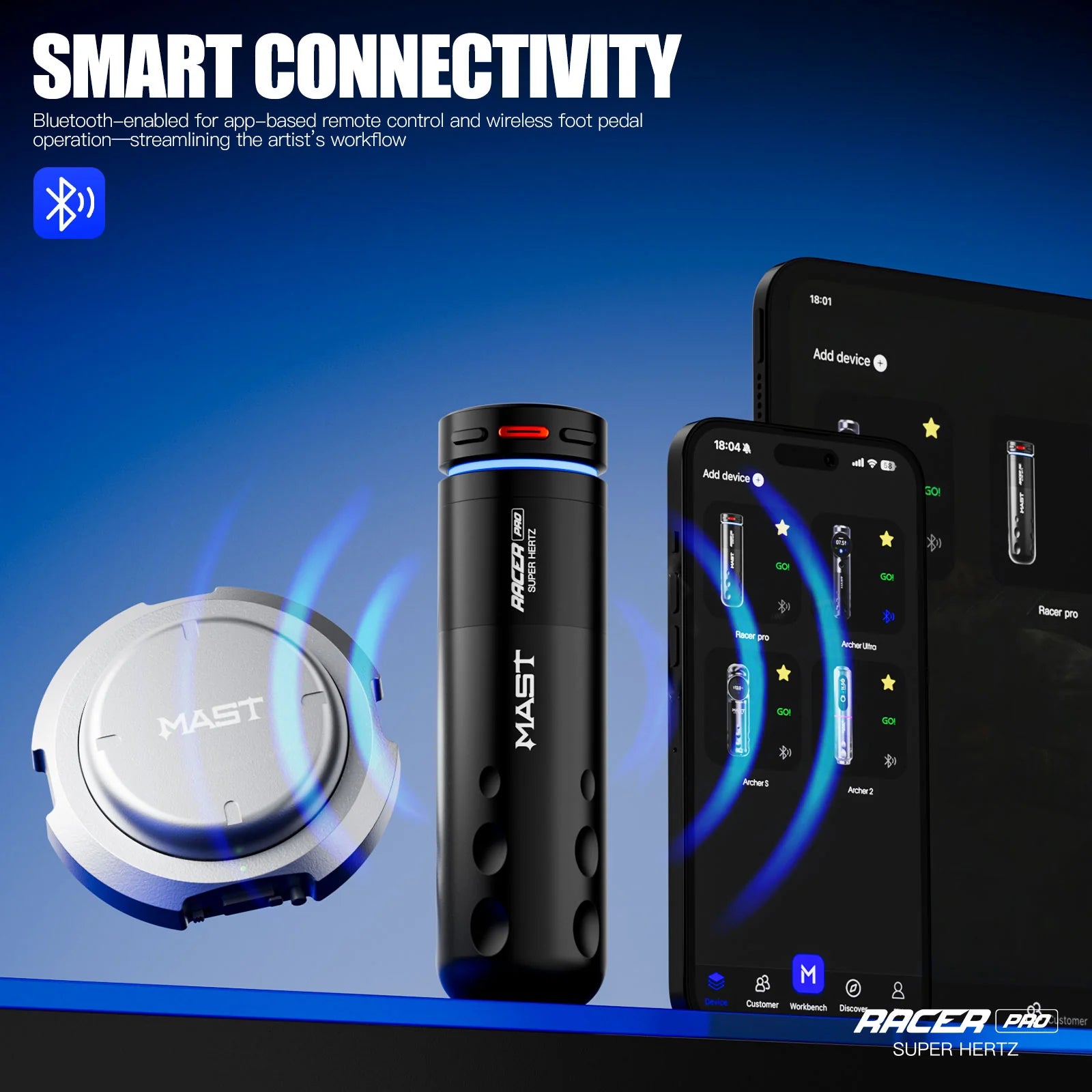 Equipped with Bluetooth connectivity, wireless foot pedal support, and a crystal-clear 0.85” HD color display, the Mast Racer Pro puts full command in your hands - allowing you to focus on the art, not the setup. Built to last, light in weight, and designed for precision, it’s the new standard of professional wireless tattoo machines.