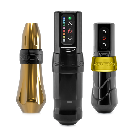 FK Irons is renowned for its innovative engineering and bold aesthetics. The Spektra Xion Rotary Machine is available in striking finishes like Golden Tiger, Stealth Tiger, and Black Tangerine, as well as Gun Metal, Frost, Ruby, Bubblegum, and Stealth. These machines feature adjustable stroke lengths, ergonomic grips, and a powerful motor for smooth, consistent performance across all tattooing styles.