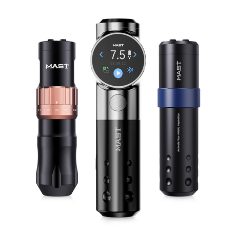 The Mast P20 Wireless Tattoo Machine comes in a variety of colors (Black, Silver, Blue, Pink, Purple), offering lightweight portability and consistent power—ideal for artists on the go. For those who want a compact, versatile option, the Mast P15 Tattoo and PMU Machine Pen is available in Black/Red, Purple, and Black, blending comfort with precision.