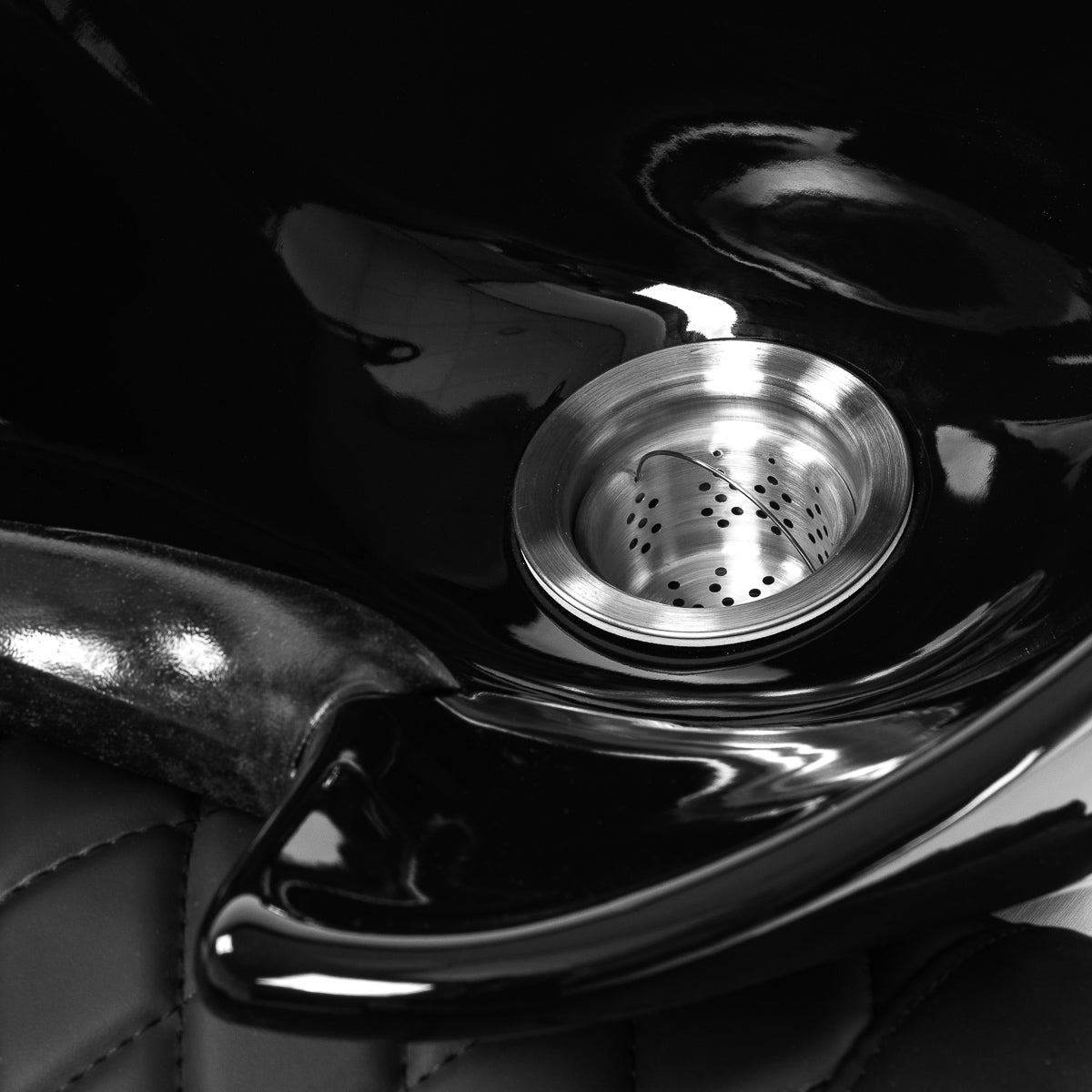 The depth of the ceramic bowl of the basin bowl in shades of black allows for comfortable and effective performance of a wide range of hairdressing services, preventing excessive splashing of water and products used during the treatment. The material used makes the washbasin durable, resistant to discolouration and scratches, and very easy to keep clean. The appropriately profiled collar and inclined backrest provide support and comfort while washing hair, and thanks to the comfortable plastic overlay in shades of black, the customer will not feel any discomfort associated with the cold ceramic surface.