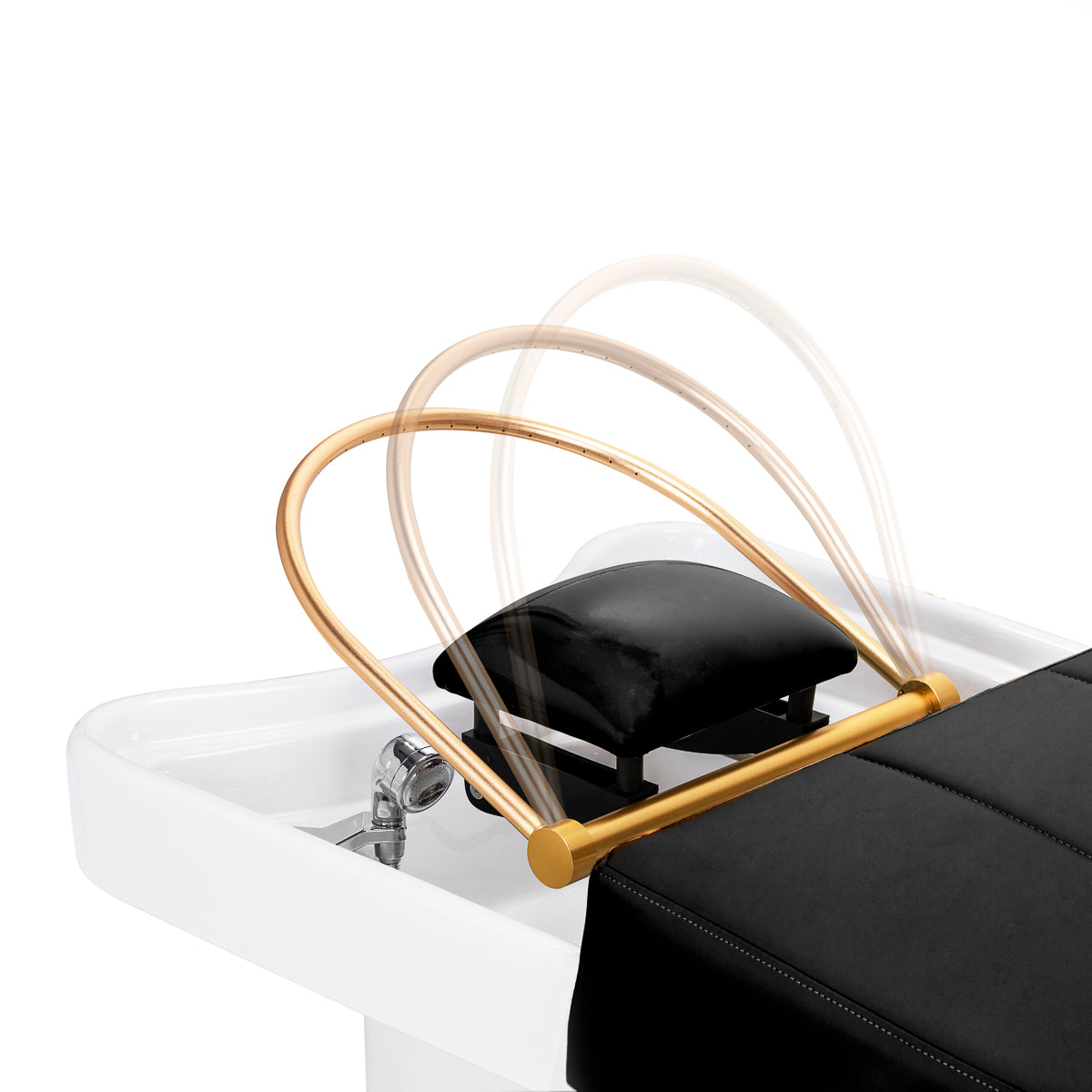 The golden arc with an adjustable angle of inclination, designed for the Waterfall Head SPA, is an innovative solution that allows for holistic care of the scalp. The water jets act as a natural massage, improving blood circulation, reducing tension and stress. The precisely controlled water flows support hair regeneration and intensively moisturise the skin. The waterfall arc with the possibility of adjusting the angle ensures deep cleansing of the scalp and relaxation, bringing relief from ailments such as headaches or stiff neck. Thanks to an intelligent closed-loop system, the arc draws water from the bowl and reuses it, providing an uninterrupted water massage. This is a combination of technology and relaxation that supports hair health and well-being.
