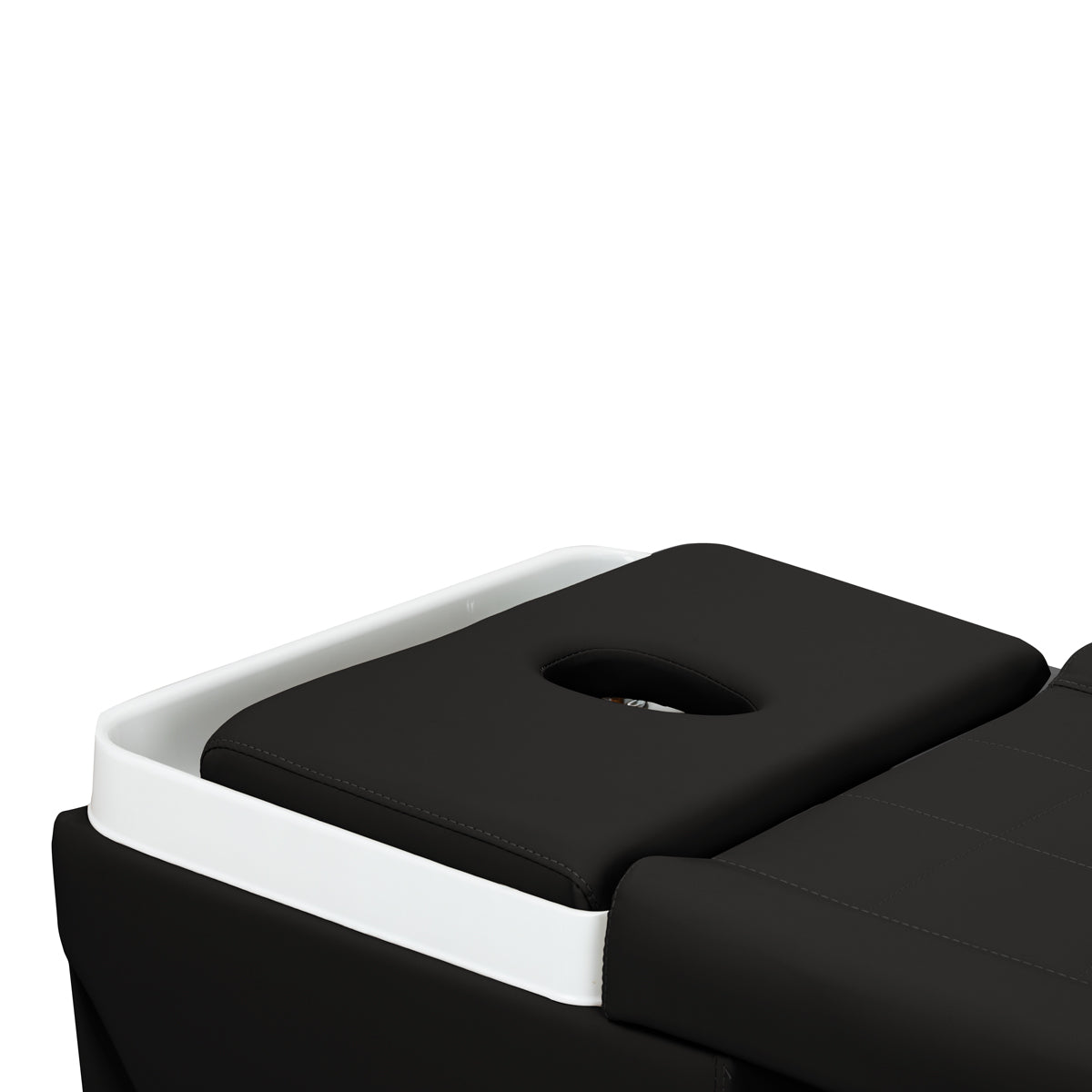 The Head Spa Maldives bed combines functionality with modern design. A sturdy frame, upholstered in elegant synthetic leather, ensures a stable structure. The ergonomically profiled surface in shades of black, covered with soft fabric, guarantees complete comfort during treatments. The additional space under the lounger allows for convenient storage of accessories, towels, and cosmetics, making it a practical and stylish addition to any professional beauty and wellness salon.