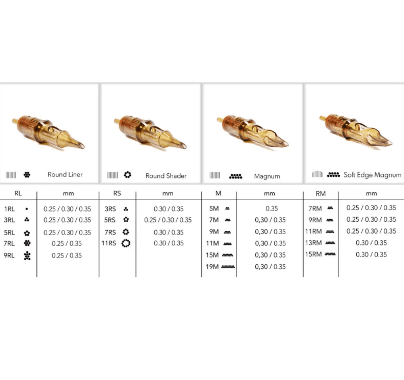 - Variety of Diameters: Available in diameters ranging from 0.25mm to 0.35mm, Kwadron Cartridges cater to various tattooing styles and preferences.
