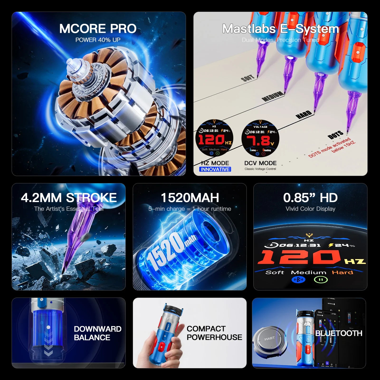 A high-performance wireless tattoo pen engineered for power, precision, and intelligent control, featuring the advanced MCORE Pro Super Motor, dual working modes, and ultra-fast charging technology for professional tattoo artists.