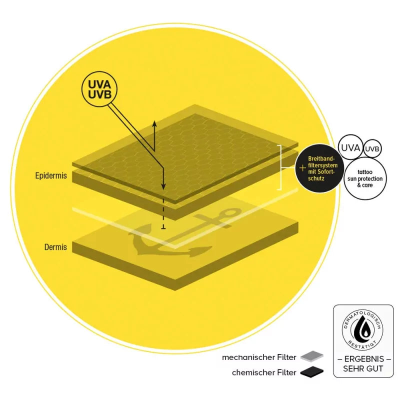 TattooMed Sun Protection SPF30 100ml is a specially developed sunscreen designed to protect tattooed skin during heavy sun exposure. Made in Germany, this advanced formula combines Tattoo Color Protection Technology with a UVA/UVB broadband filter to shield your tattoos from harmful rays and environmental influences, helping to prevent fading and keep your ink vibrant.